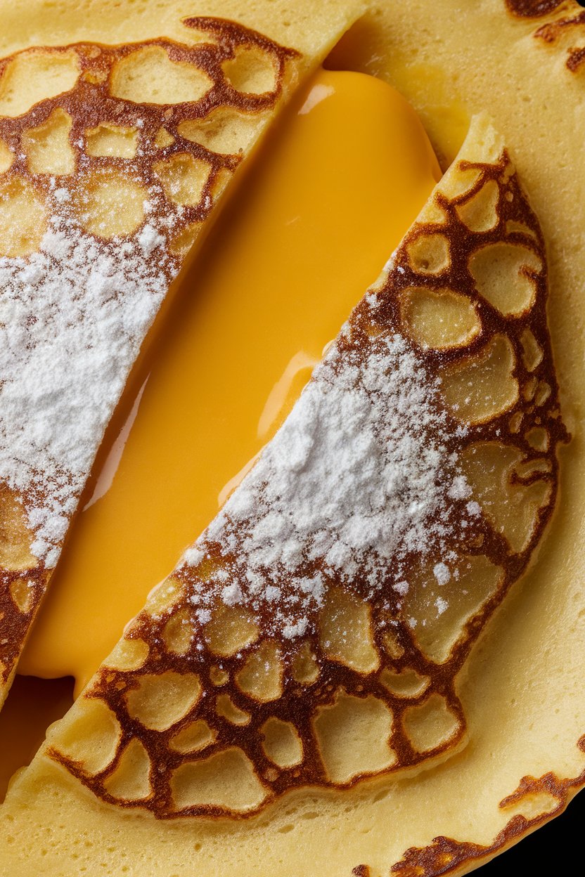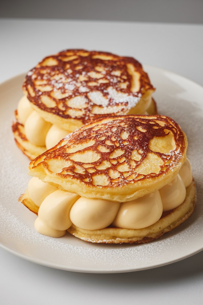 - Fill the pancakes: Cut the pancakes in half and fill with custard using a piping bag or spoon. Sandwich the pancakes together and serve warm.
