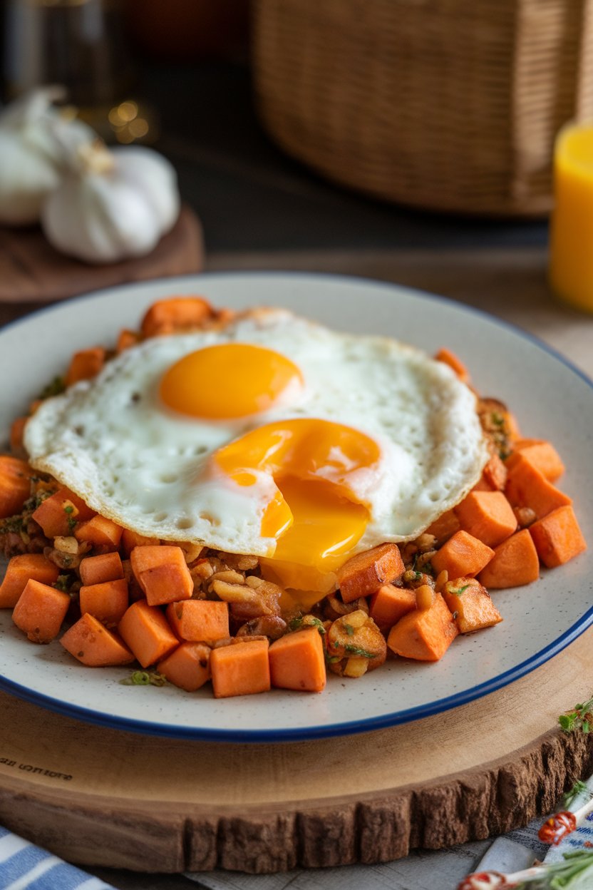 Heat your skillet over medium heat before adding the sweet potatoes, onions, and garlic. Cook the hash for about 15-20 minutes, stirring occasionally, until the sweet potatoes are tender and caramelized. Fry the eggs in a separate skillet over medium heat until the whites are set but the yolks are still runny, about 3-4 minutes.
