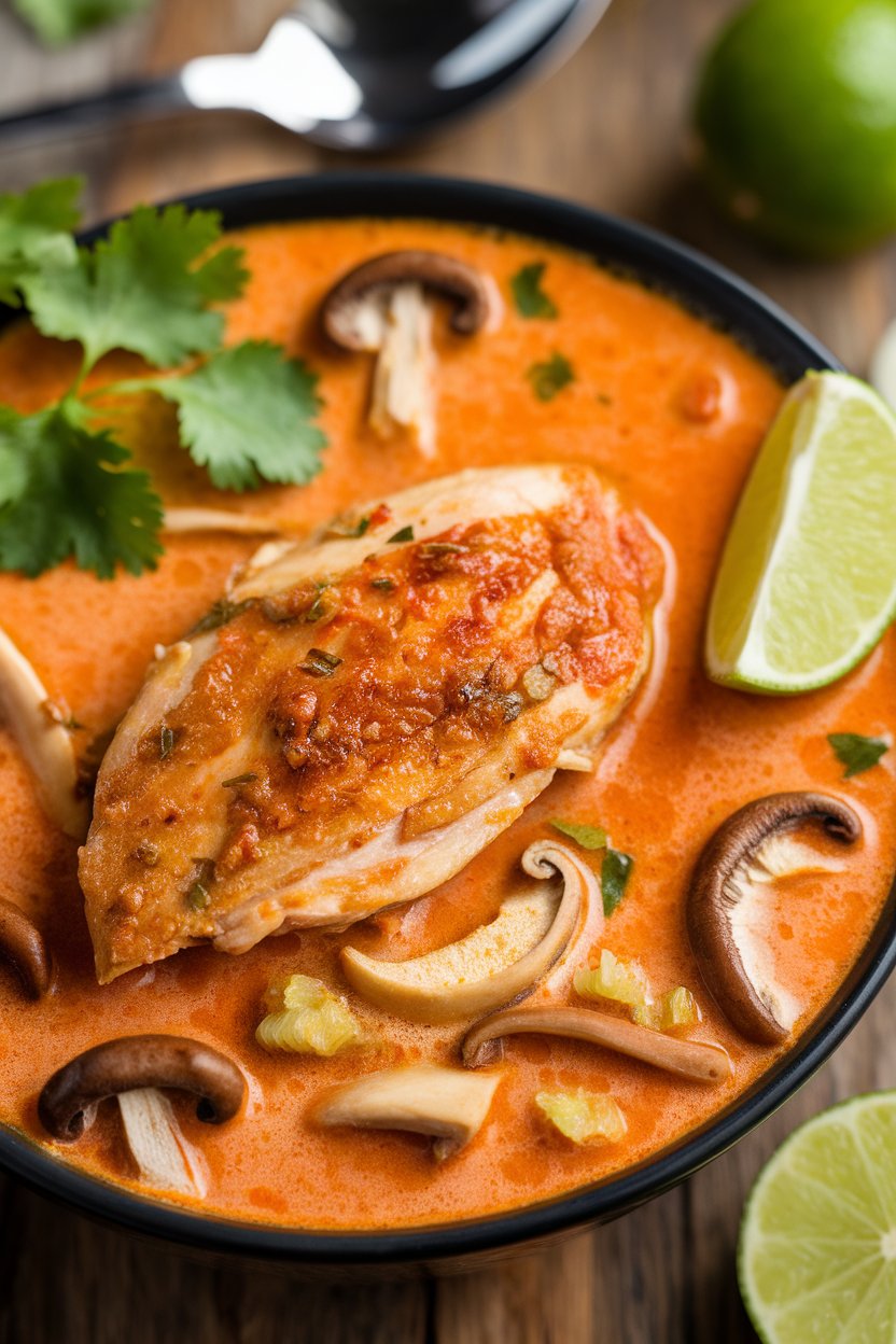 Once the soup is simmering, add the mushrooms and chicken breast, cooking until the chicken is cooked through. Stir in the fish sauce and lime juice, adjusting the seasoning to taste. Serve the soup hot, garnished with fresh cilantro leaves.