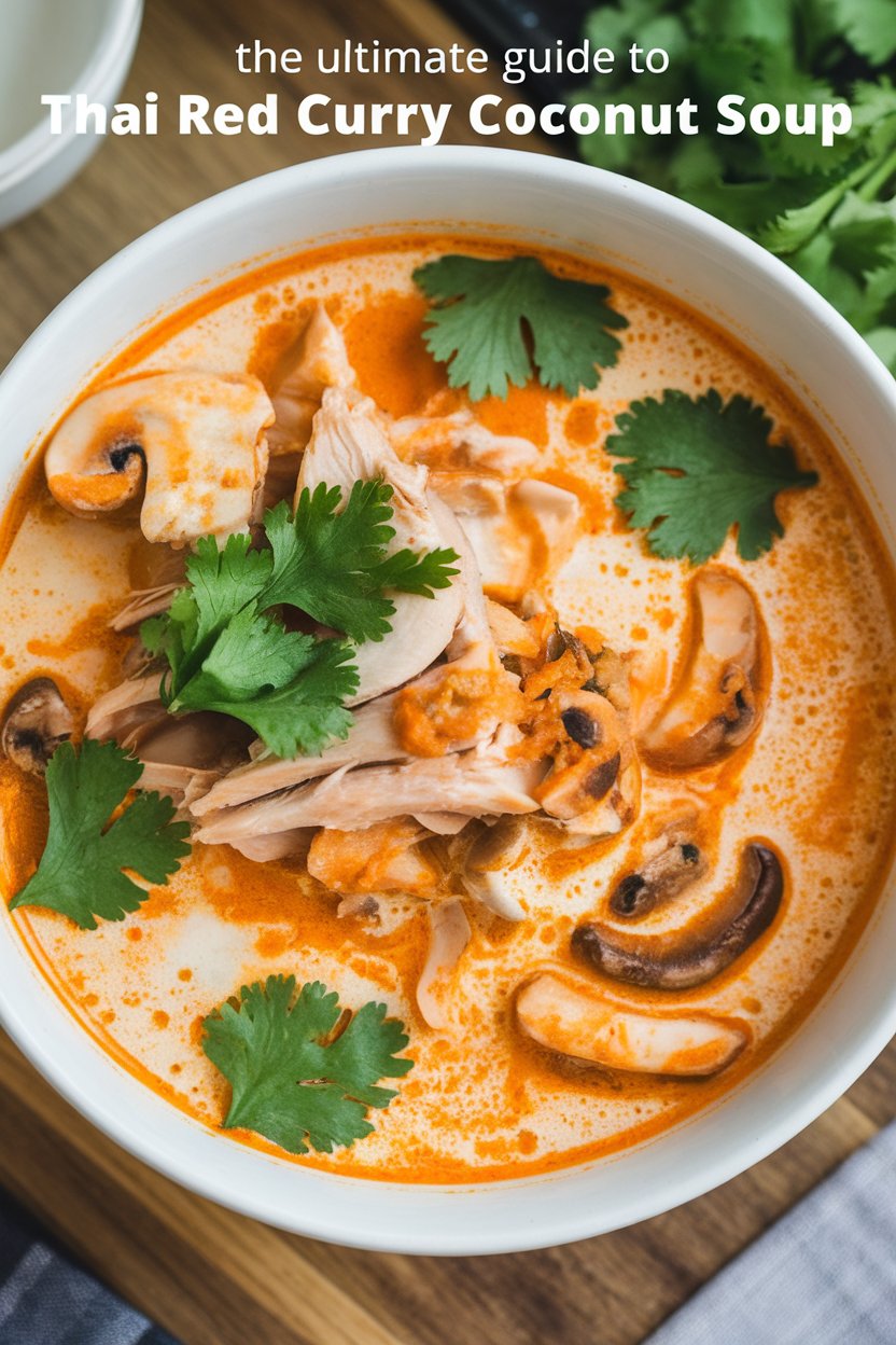 To make Thai Red Curry Coconut Soup, start by heating a saucepan over medium heat. Add the coconut milk and red curry paste, stirring until the paste is fully incorporated into the milk. Add the chicken broth, lemongrass, ginger, garlic, and chili pepper, and bring the mixture to a simmer.